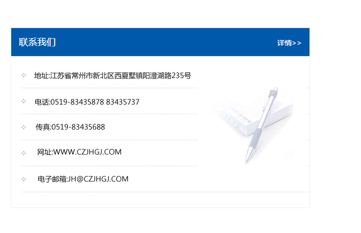 地址:常州市新北區友邦商務大廈1幢16、17層  電話:0519-85101652  傳真:0519-85112595  郵編:213022  網址:www_cz-jiayue_cn.zzchangzheng.com  郵箱:xiajifengaa@163.com